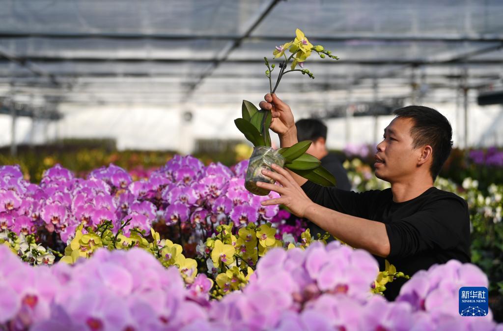 11月29日,工人在溫室里擺放蝴蝶蘭。