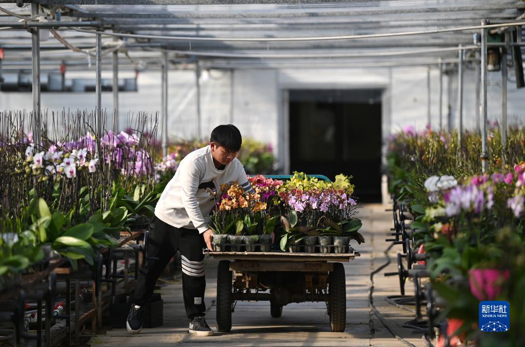 11月29日,工人在溫室里搬運蝴蝶蘭。