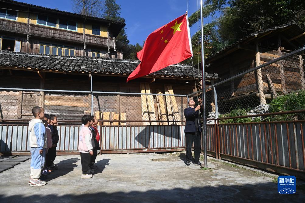 11月29日,廣西龍勝各族自治縣龍脊鎮滿田小學的潘從漢老師和學生升國旗。