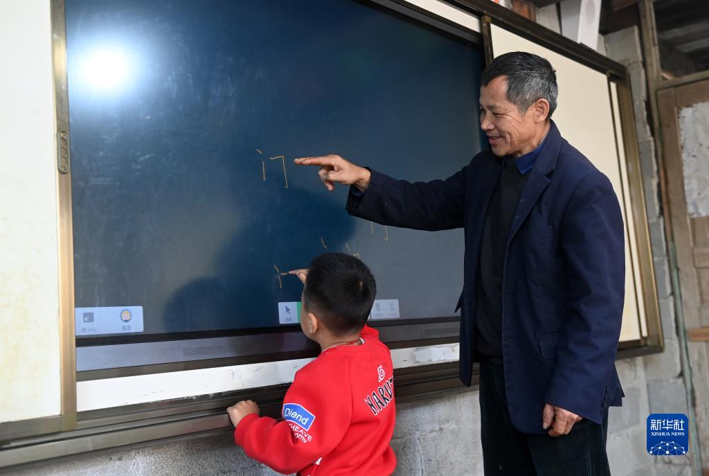 11月29日,廣西龍勝各族自治縣龍脊鎮滿田小學的潘從漢老師在課堂上教學生寫字。
