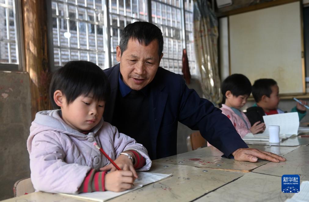 11月29日,廣西龍勝各族自治縣龍脊鎮滿田小學的潘從漢老師在課堂上輔導一名學生功課。