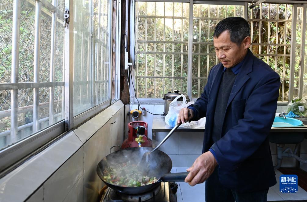 11月29日,廣西龍勝各族自治縣龍脊鎮滿田小學的潘從漢老師在課間炒菜給學生做午飯。