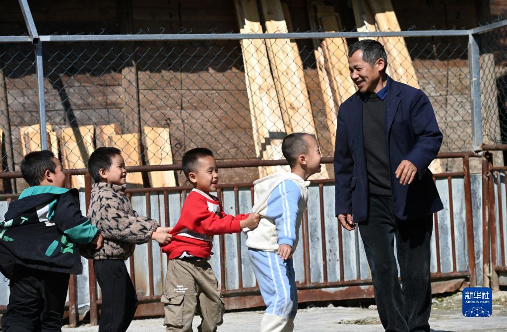 11月29日,廣西龍勝各族自治縣龍脊鎮滿田小學的潘從漢老師在課間和學生做游戲。