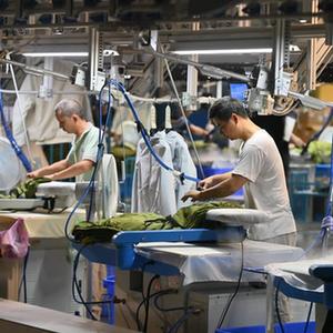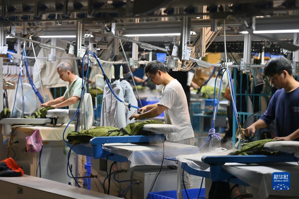 11月30日,在廣西北流市“玉商回歸產業園”一家服裝生產企業,工人在生產線上作業。