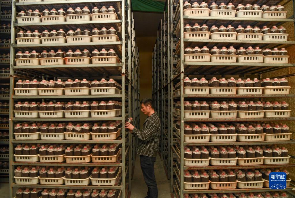 11月29日,何埂鎮豐樂村一食用菌種植企業工作人員在養菌房查看菌絲生長情況。
