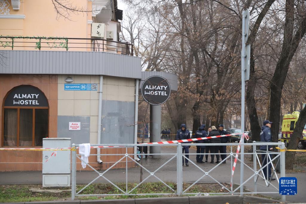 11月30日,在哈薩克斯坦阿拉木圖市,安全人員在發生火災的旅店進行善后工作。