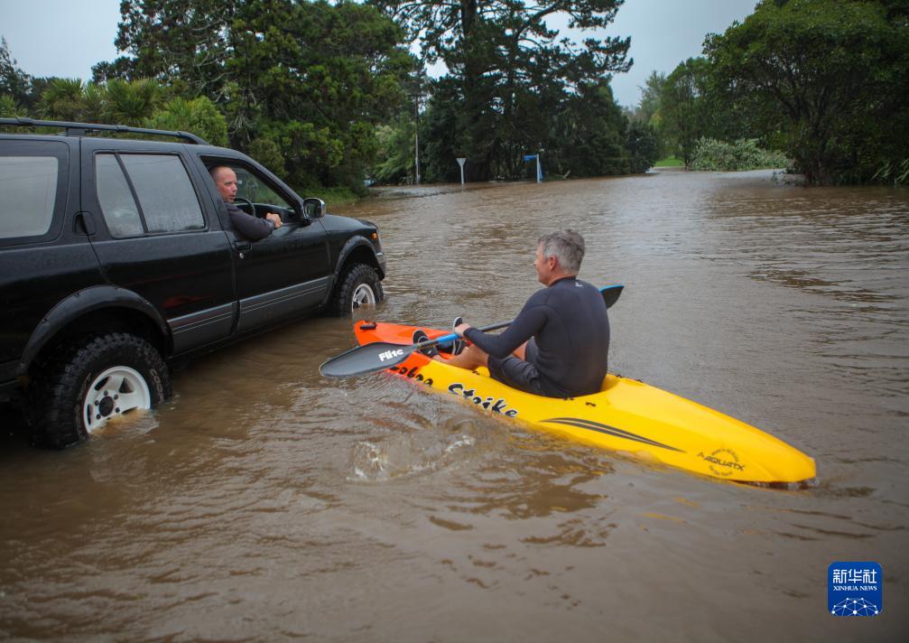 2023年2月14日,在新西蘭奧克蘭,一名男子在積水路段劃船出行。颶風“加布麗埃爾”2月13日在新西蘭北島最北端登陸,給該地區帶來大面積洪澇災害,特別是北島東部的霍克斯灣地區受災嚴重。新西蘭于2月14日宣布進入國家緊急狀態,這也是新西蘭歷史上第三次進入國家緊急狀態。