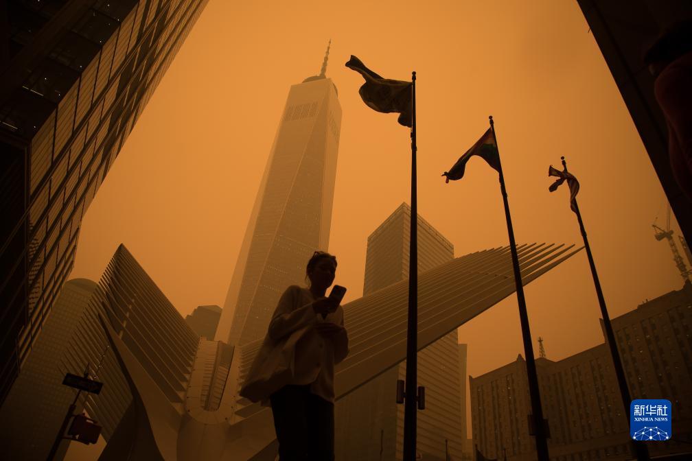 2023年6月7日,一名行人從煙塵籠罩的美國紐約曼哈頓世貿中心附近走過。加拿大多地森林野火產生的大量煙霾南移,美國紐約市空氣出現嚴重污染,民眾生活受到影響。