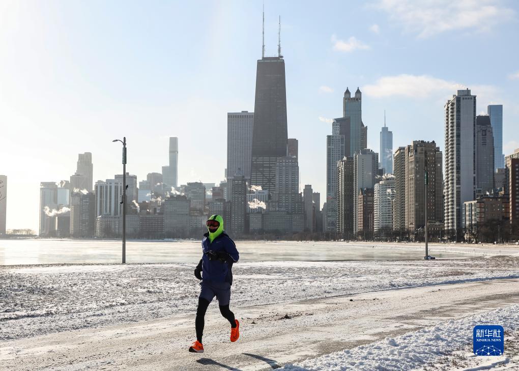 2022年12月24日,一名男子冒著嚴寒在美國芝加哥密歇根湖畔跑步。一場冬季風暴在美國造成至少35人遇難,還一度造成美國上百萬用戶停電。
