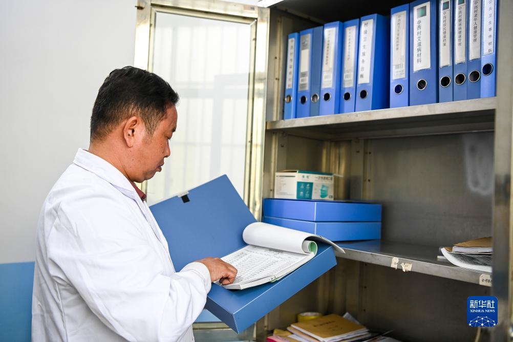 11月29日,黃增亮在村衛生室內整理村民們的健康檔案。