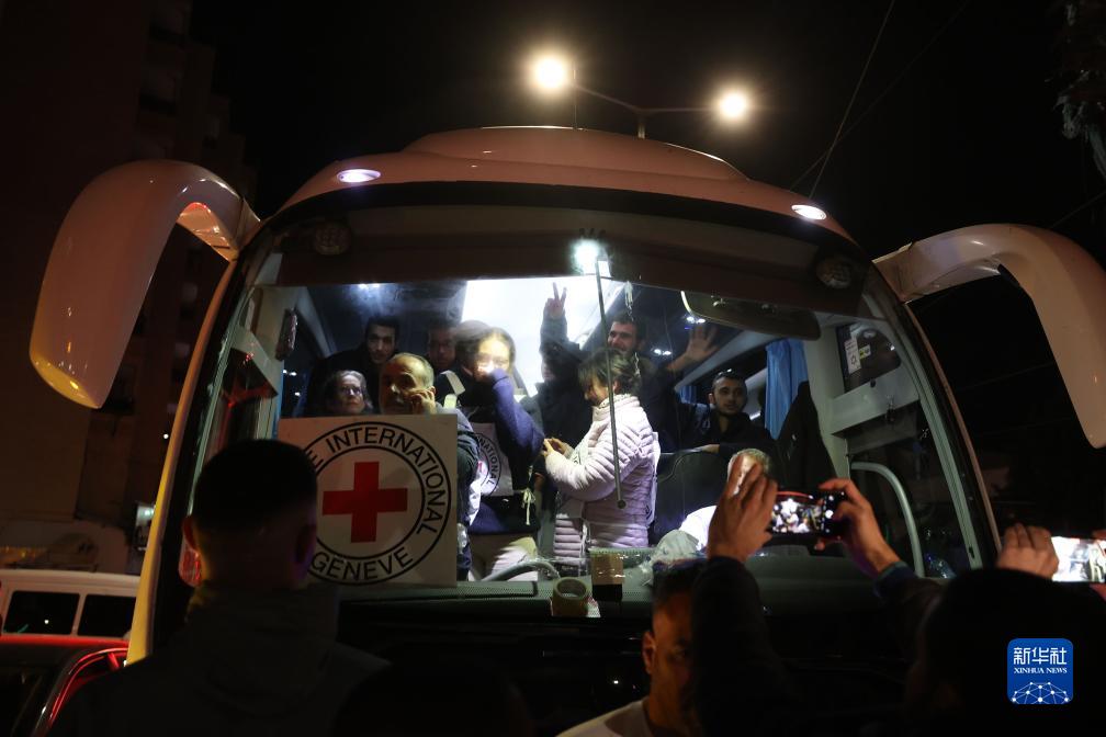 11月30日,載有獲釋巴勒斯坦被關押人員的大巴抵達約旦河西岸城市拉姆安拉。