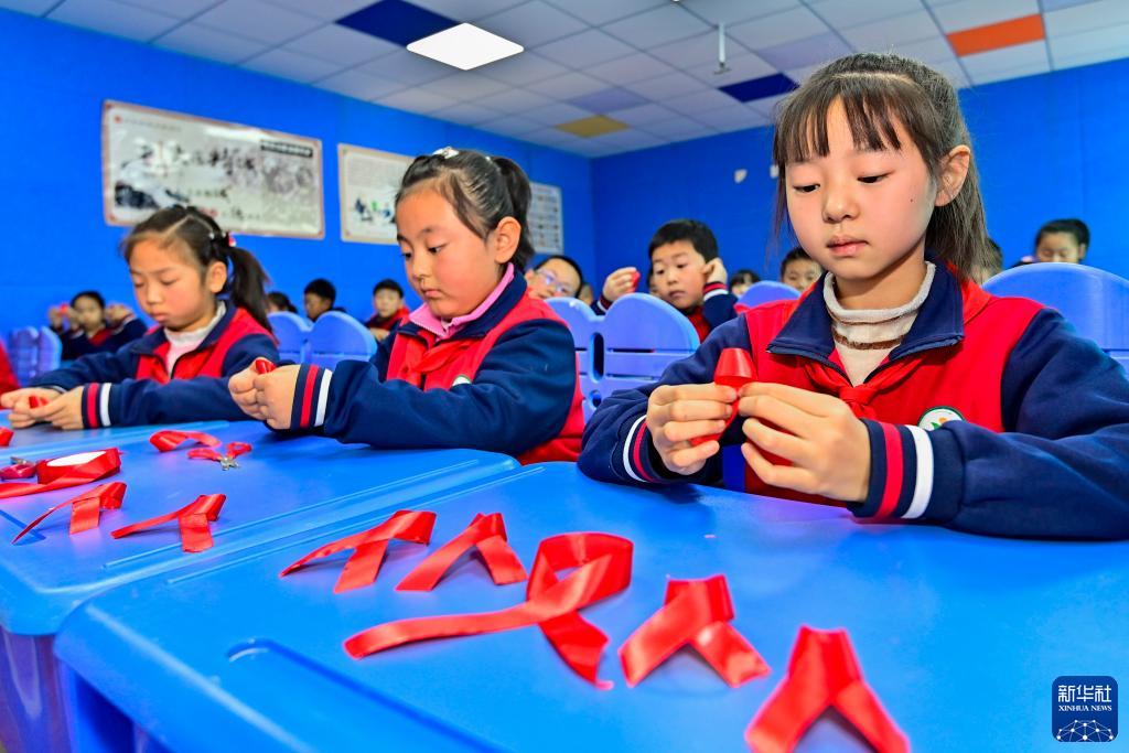11月29日,山東省青州市云門山街道孟家小學學生在預防艾滋病主題活動中制作紅絲帶。