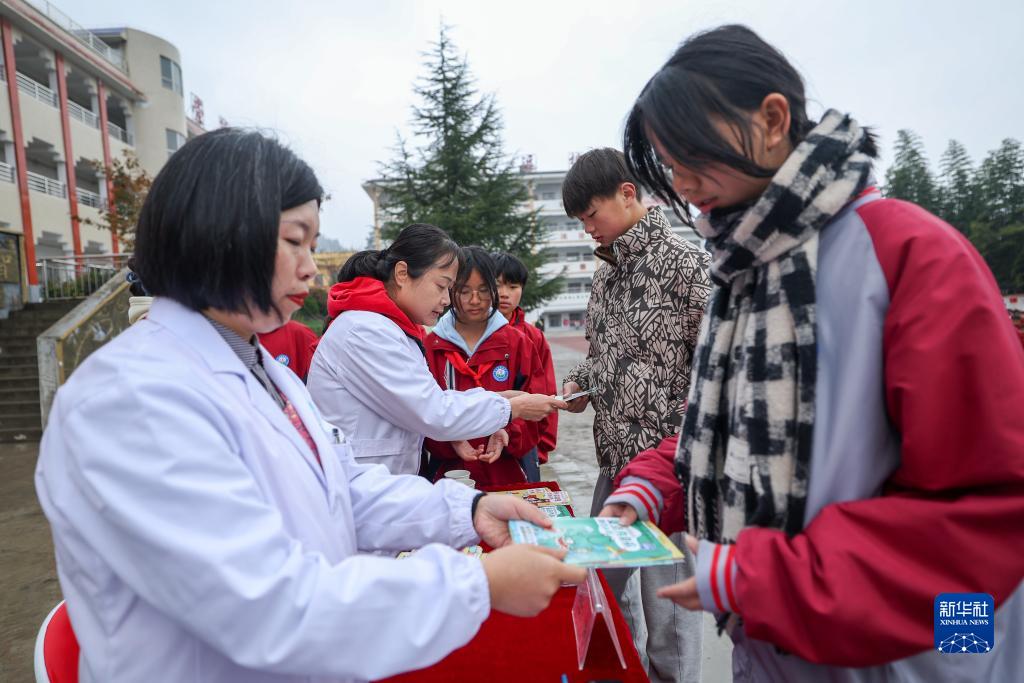 11月30日,貴州省畢節市赫章縣漢陽街道金田社區衛生服務中心醫務人員向赫章縣第五中學學生發放艾滋病預防宣傳資料。