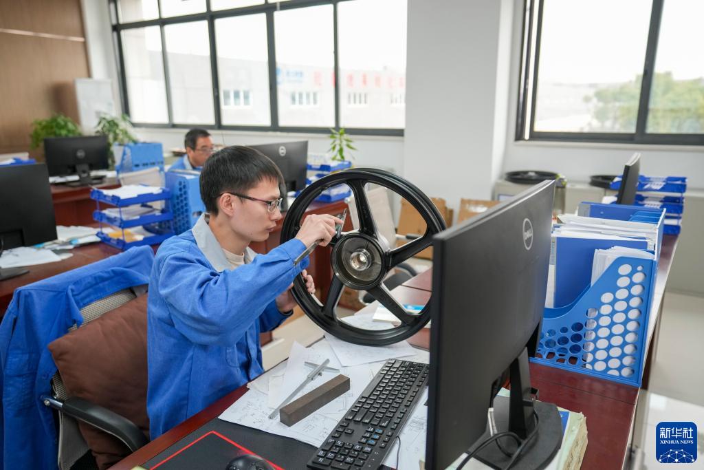 11月28日,在重慶墊江縣重慶捷力輪轂制造有限公司的研發中心,一名科研人員研究摩托車輪轂產品的改進。