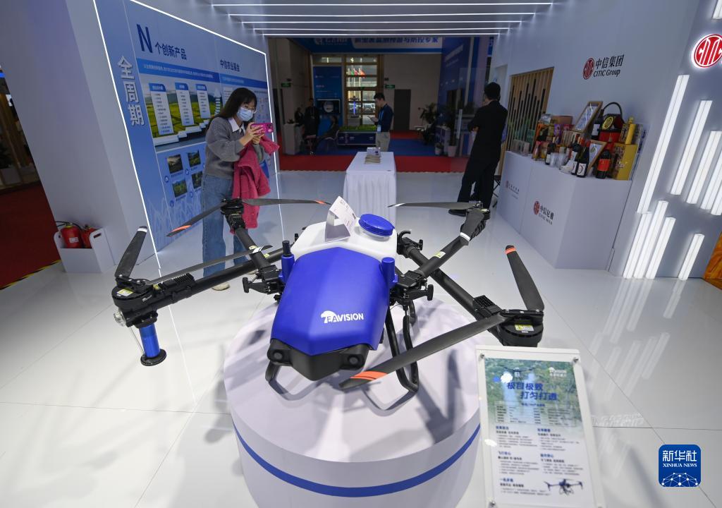 11月30日,在鏈博會綠色農業鏈展區中信集團展臺,參觀者觀看一臺智能植保無人機。