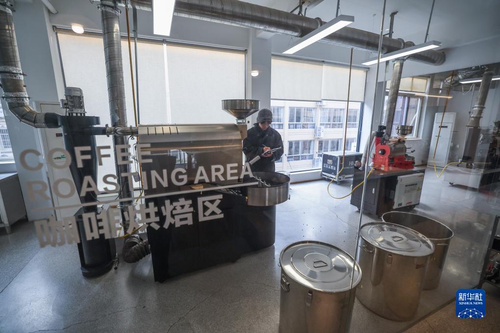 11月30日,青田與非咖啡工廠店的員工在烘焙咖啡豆。