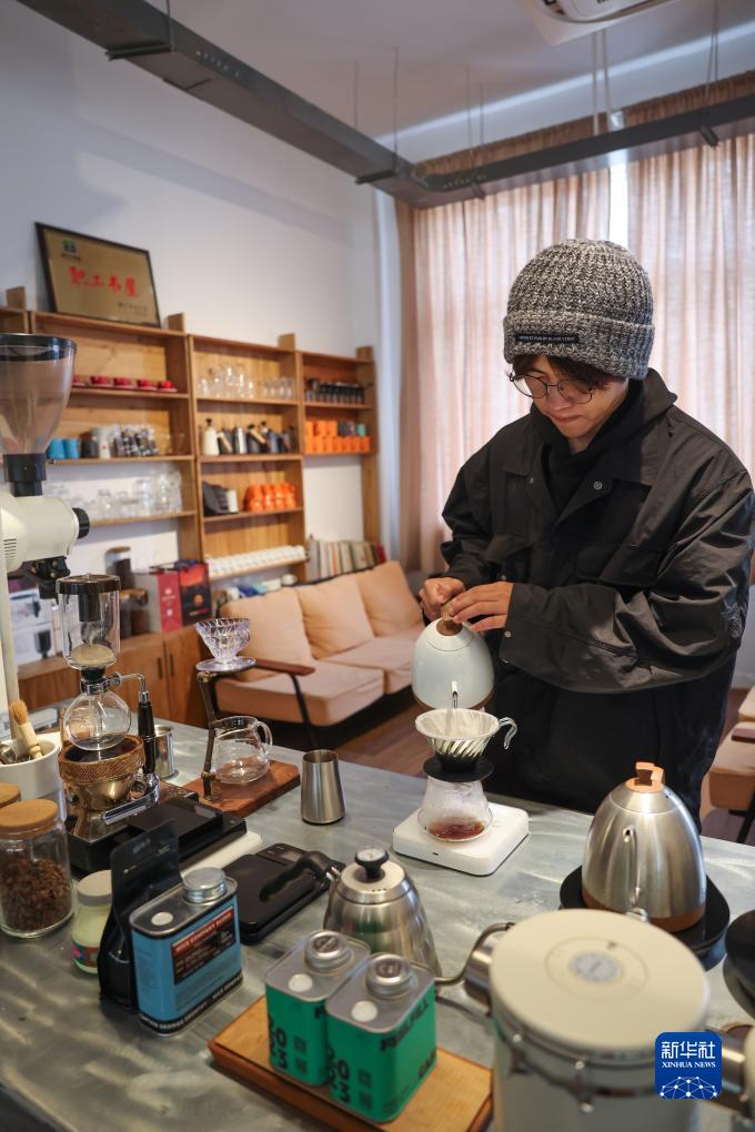 11月30日,青田與非咖啡工廠店的員工在制作手沖咖啡。