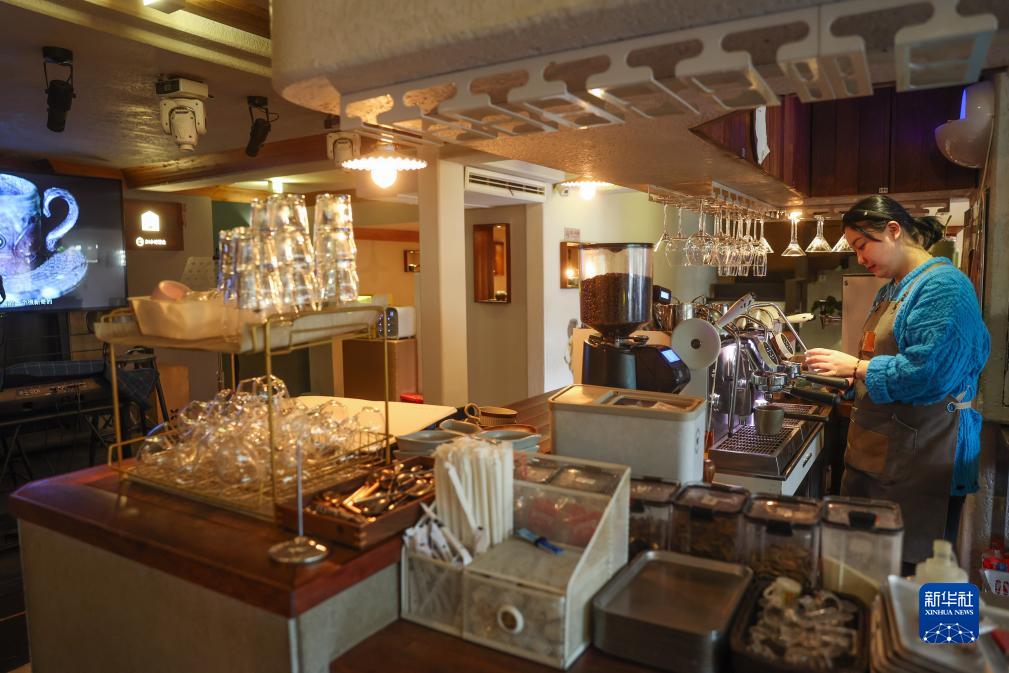 11月30日,在青田縣城的誠磊24小時咖啡館里,工作人員在制作咖啡。