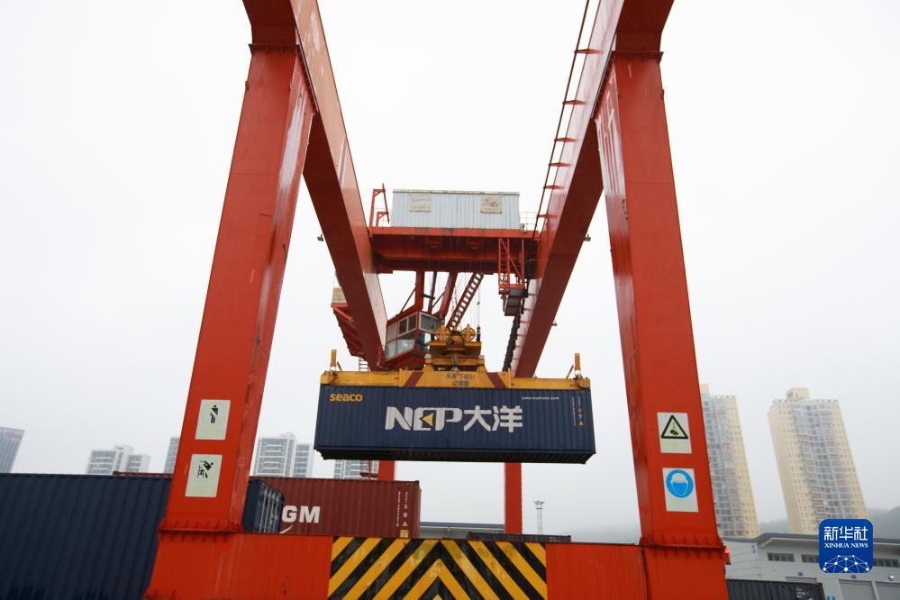 11月30日,一列中歐班列在貴陽國際陸港都拉營站裝載集裝箱。