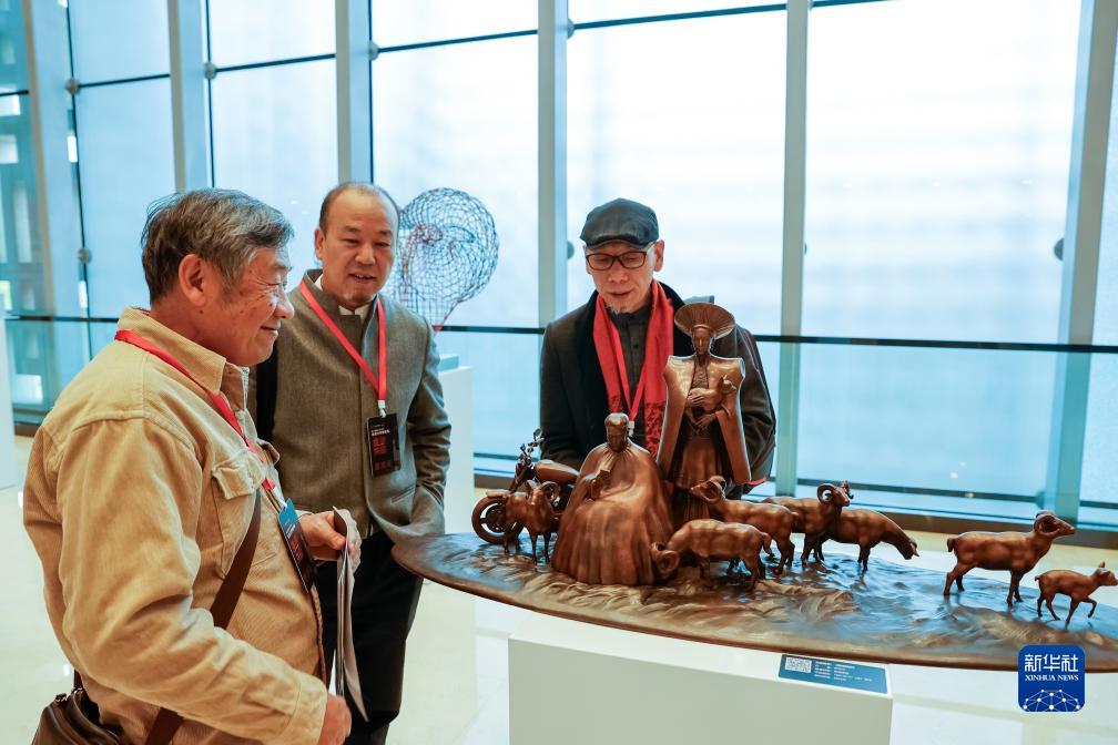 11月30日,雕塑家們在討論首屆天府雕塑展上展出的作品。