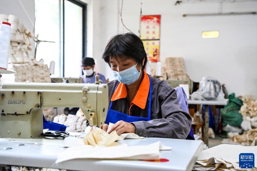 11月30日,在貴港市港北區一家就業幫扶車間,當地群眾在加工勞保用品。