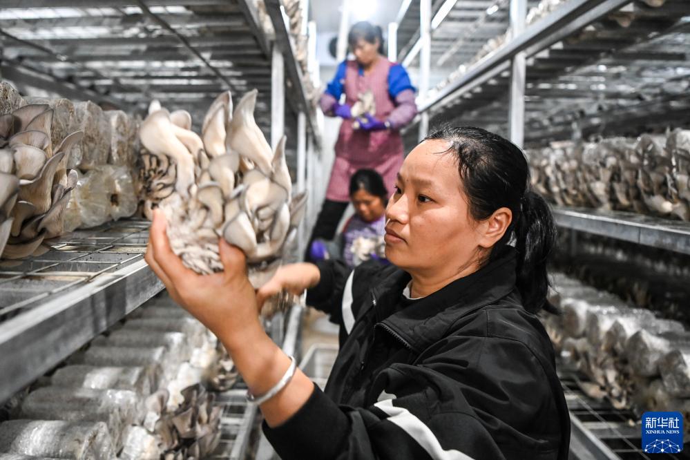 11月30日,在貴港市港北區一家就業幫扶車間,當地群眾在采收蘑菇。