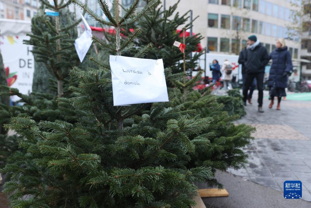 這是11月30日在比利時布魯塞爾街頭拍攝的幾棵待售的圣誕樹。
