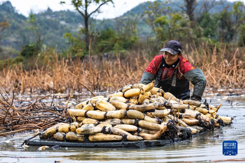 11月30日,農民在貴州省安順經濟技術開發區十里荷廊景區轉運采收的蓮藕。