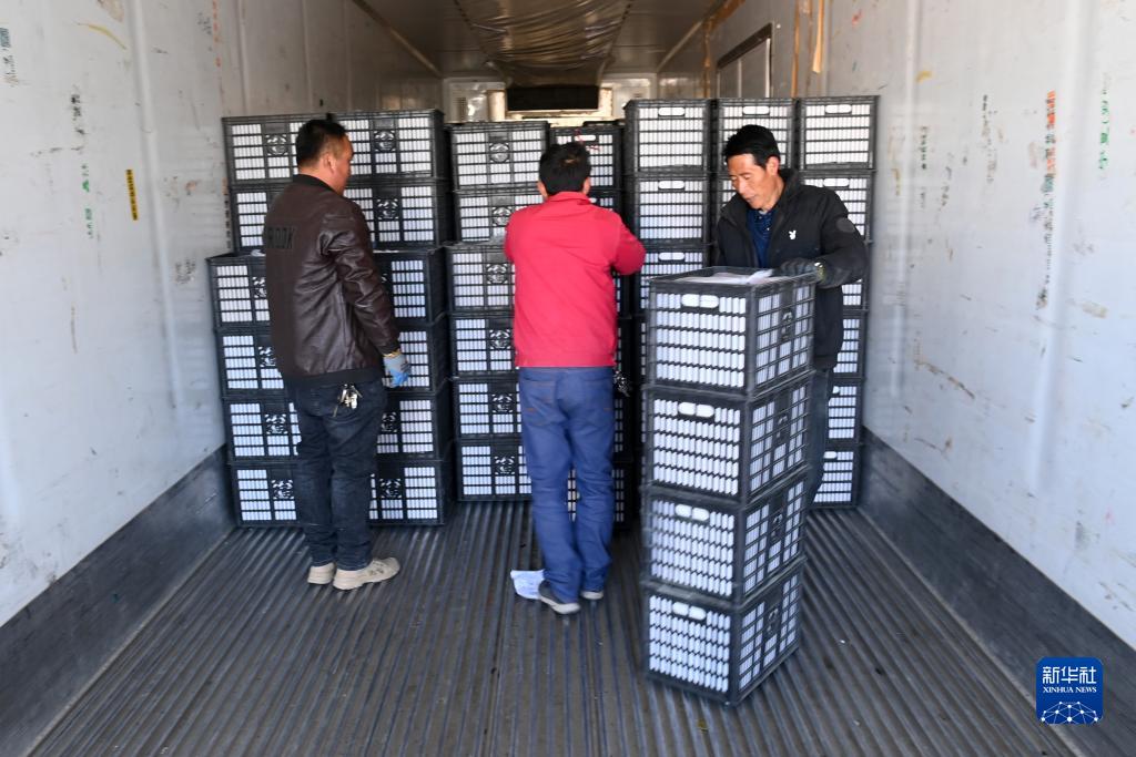 11月30日,在慶城縣白馬鋪鎮白馬鋪村的一處果業農民專業合作社,工作人員將分揀好的蘋果裝車。