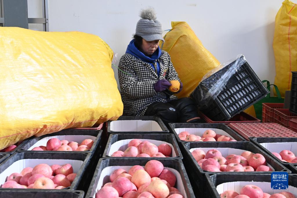 11月30日,在慶城縣白馬鋪鎮白馬鋪村的一處果業農民專業合作社,工作人員在蘋果分揀包裝線上作業。