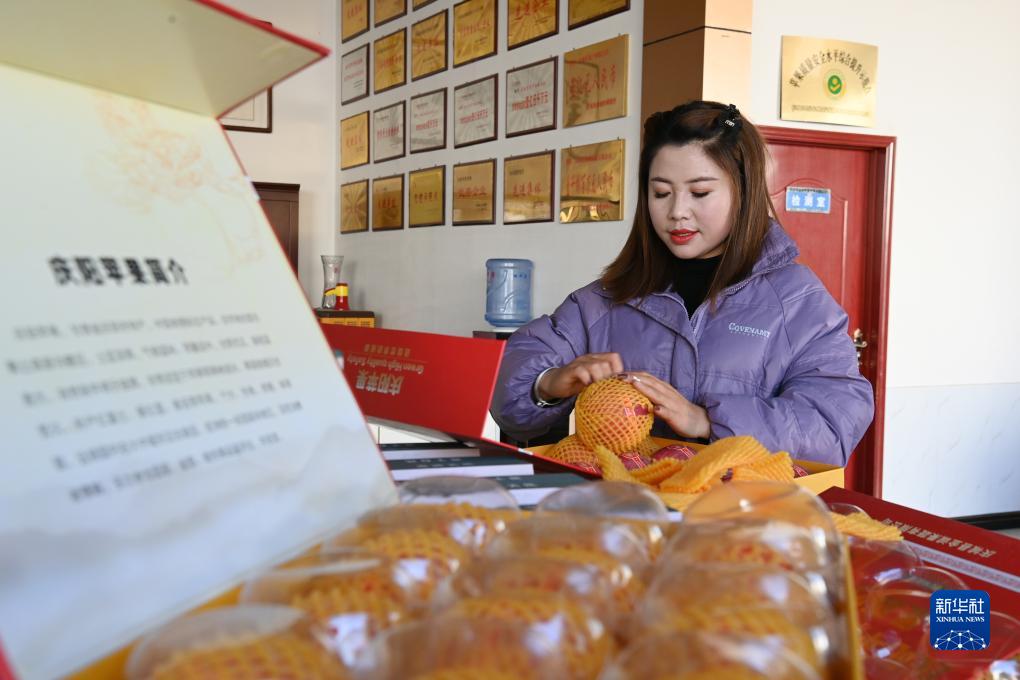 11月30日,在慶城縣白馬鋪鎮白馬鋪村的一處果業農民專業合作社,工作人員包裝蘋果禮盒。