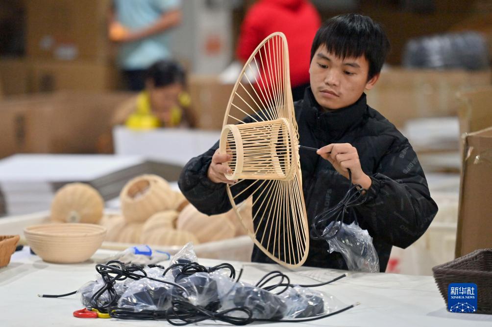 廣西玉林市博白縣一家編織工藝品生產企業的工人在制作工藝品(11月30日攝)。