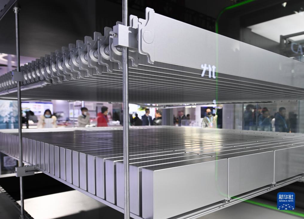12月1日在鏈博會智能汽車鏈展區寧德時代展臺拍攝的一款名為“麒麟電池”的產品。