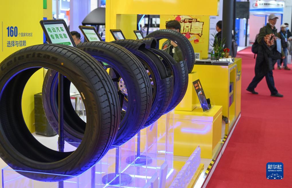 在智能汽車鏈展區,山東華盛橡膠有限公司展臺展示電動汽車專用輪胎(11月30日攝)。