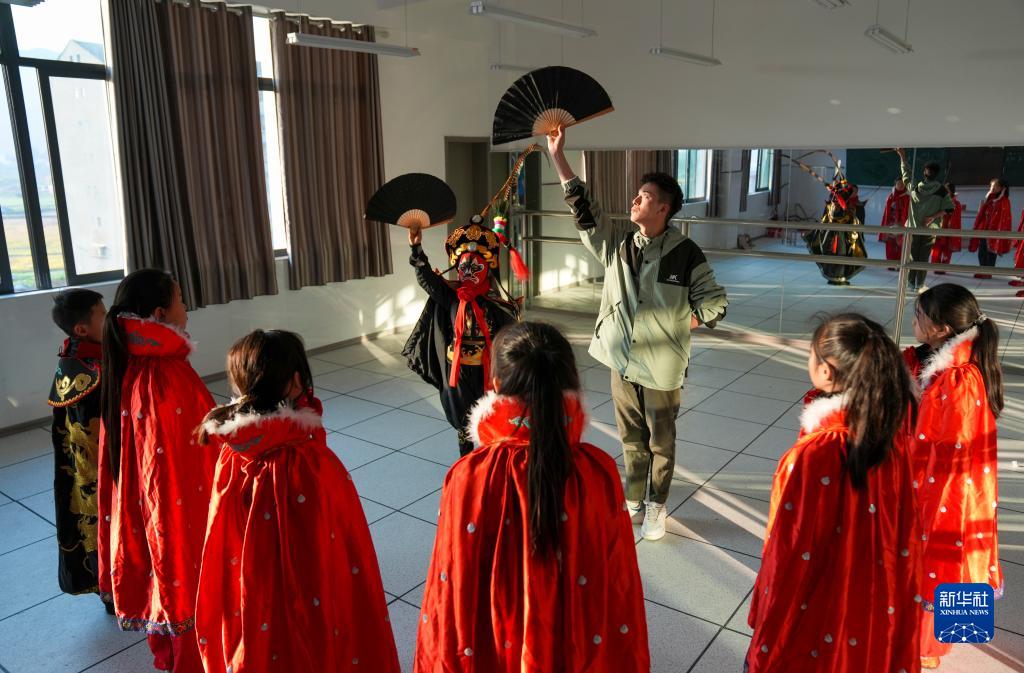 11月28日,在墊江縣武安小學校的舞蹈室內,民間藝人李勇(后排右一)為學生進行川劇變臉表演中的動作示范。