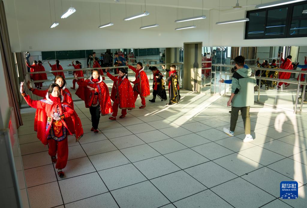11月28日,在墊江縣武安小學校的舞蹈室內,民間藝人李勇(右一)指導川劇變臉社團的學生進行基本功練習。
