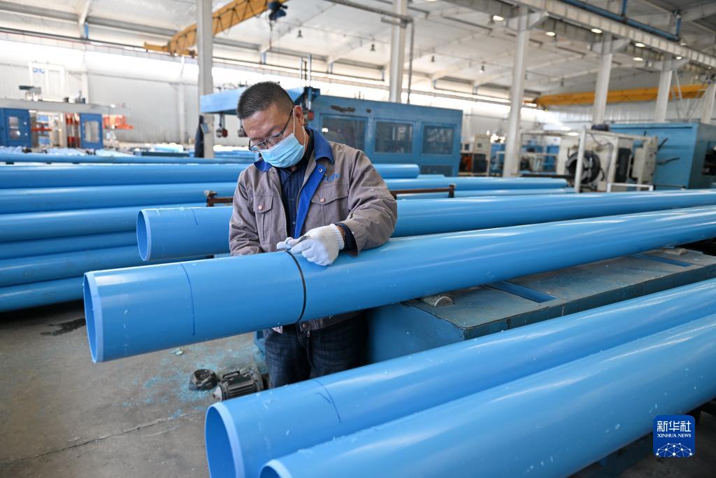 12月1日,位于望都縣的河北萬利泰歐勒管業有限公司工人在測量PVC管材尺寸。