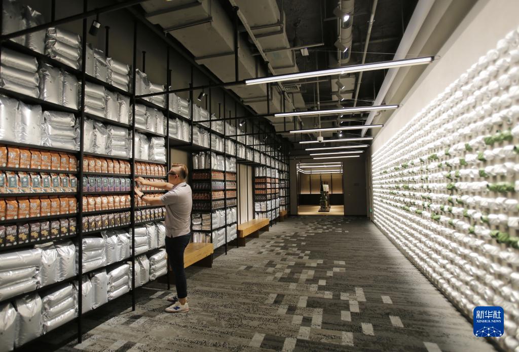 9月18日,工作人員在位于江蘇昆山的星巴克中國咖啡創新產業園整理咖啡豆陳列架。