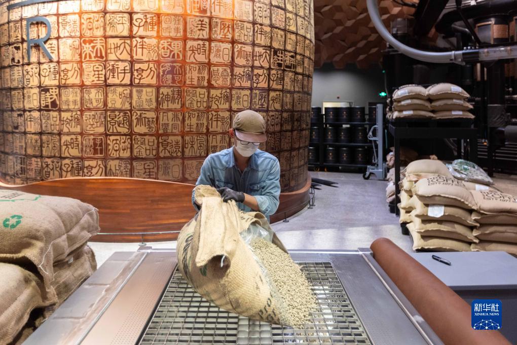 11月24日,生產伙伴在星巴克臻選上海烘焙工坊倒出咖啡生豆。