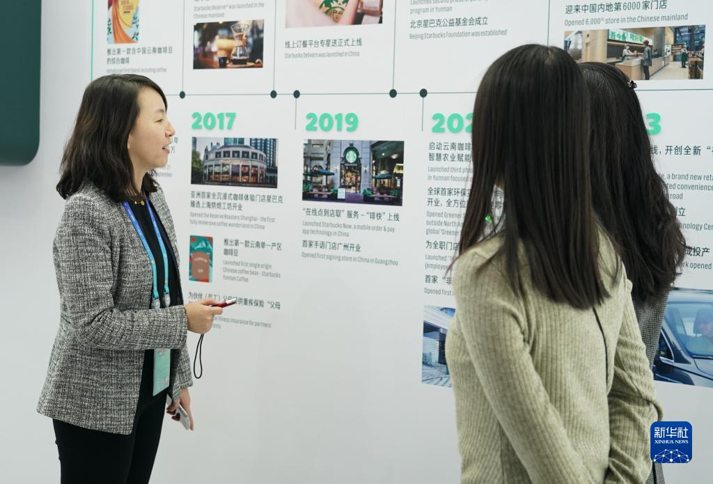工作人員(左)在首屆中國國際供應鏈促進博覽會現場向觀眾介紹星巴克的咖啡產業鏈(11月28日攝)。