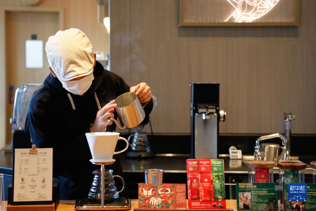 11月23日,咖啡師在位于北京市豐臺區西鐵營的星巴克咖啡手語門店為顧客制作手沖咖啡。