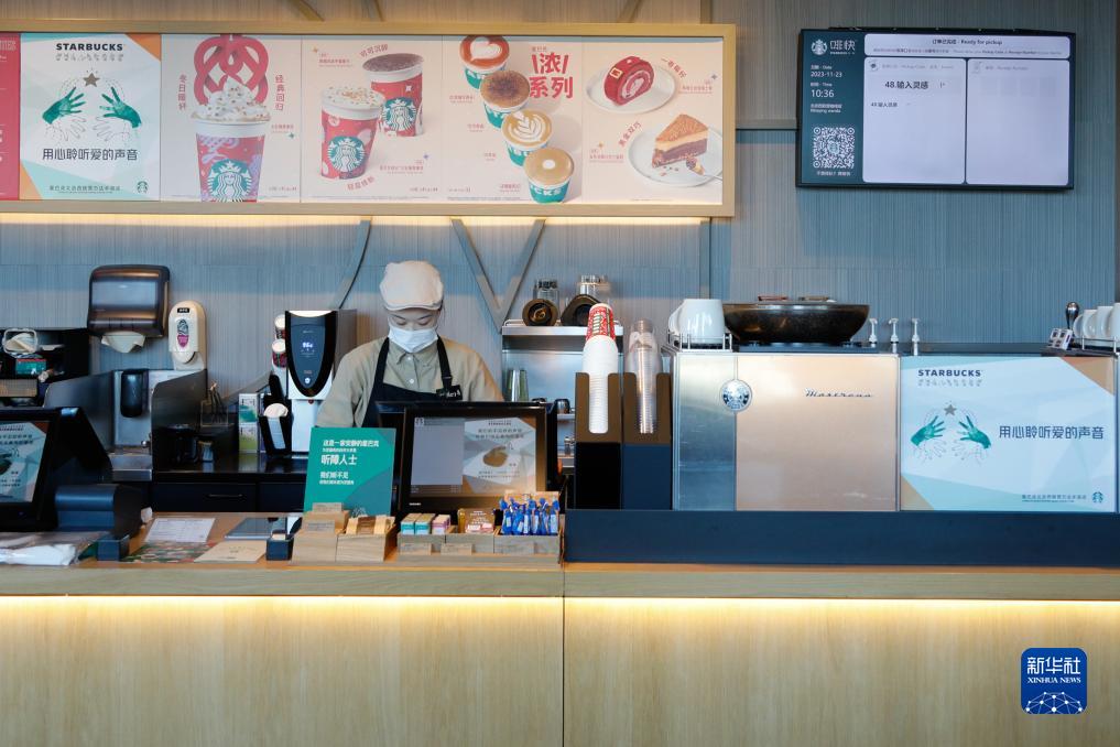 11月23日,咖啡師在位于北京市豐臺區西鐵營的星巴克咖啡手語門店工作。