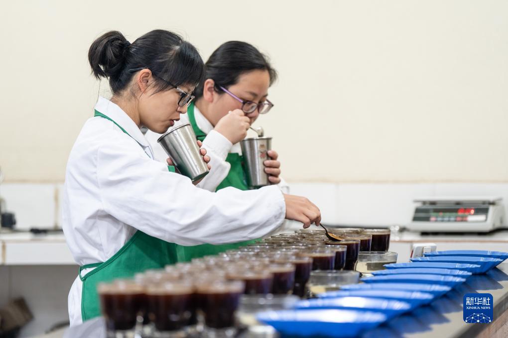 杯測師在位于云南省普洱市的星巴克種植者支持中心對咖啡生豆進行杯測(11月28日攝)。