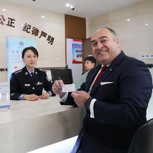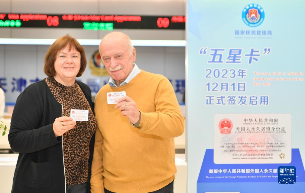12月1日,外籍人士在天津市公安局出入境管理局展示新領取的“五星卡”。