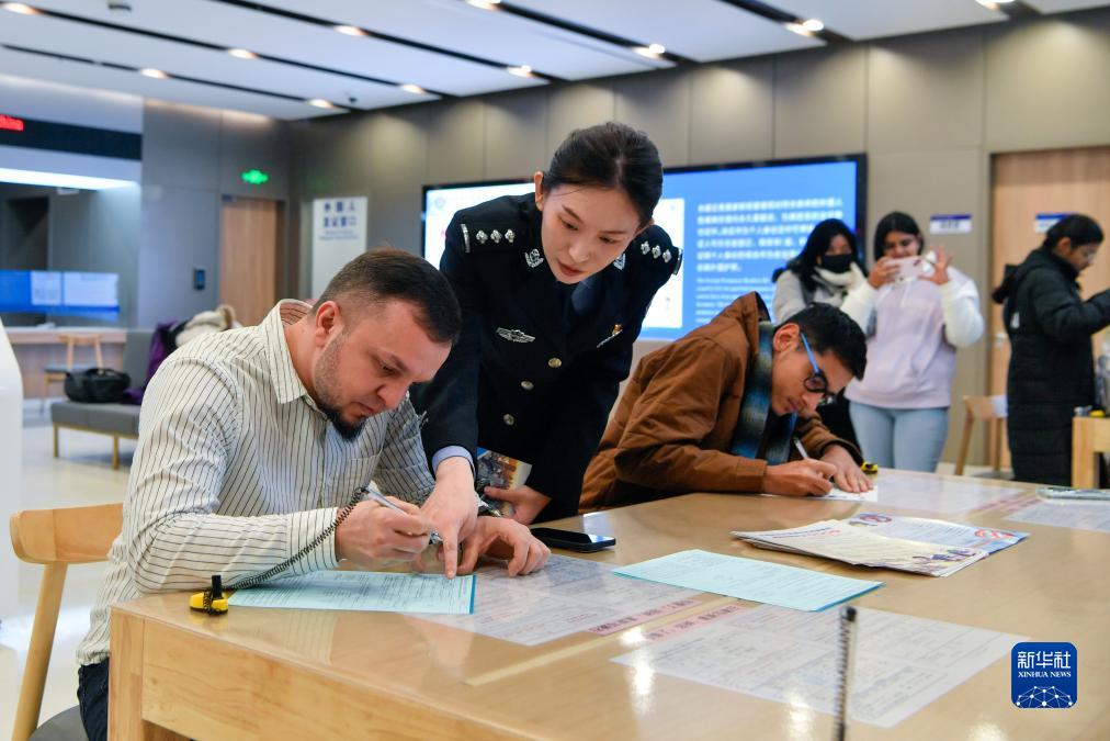 12月1日,天津市公安局出入境管理局的民警指導外籍人士填寫“五星卡”申請表格。