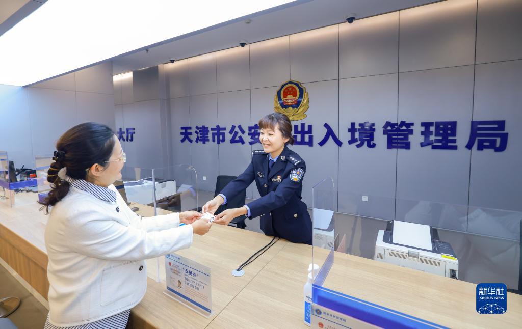 12月1日,天津市公安局出入境管理局的民警將辦理完的“五星卡”交到辦理人手中。