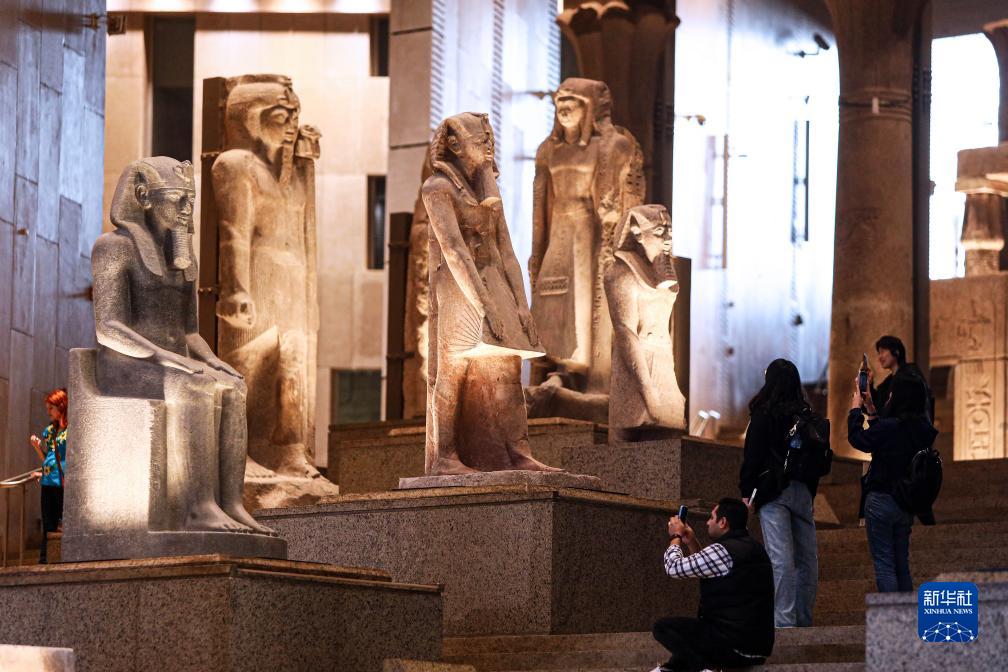 11月30日,人們在埃及吉薩的大埃及博物館參觀“大樓梯”走廊上的雕像。
