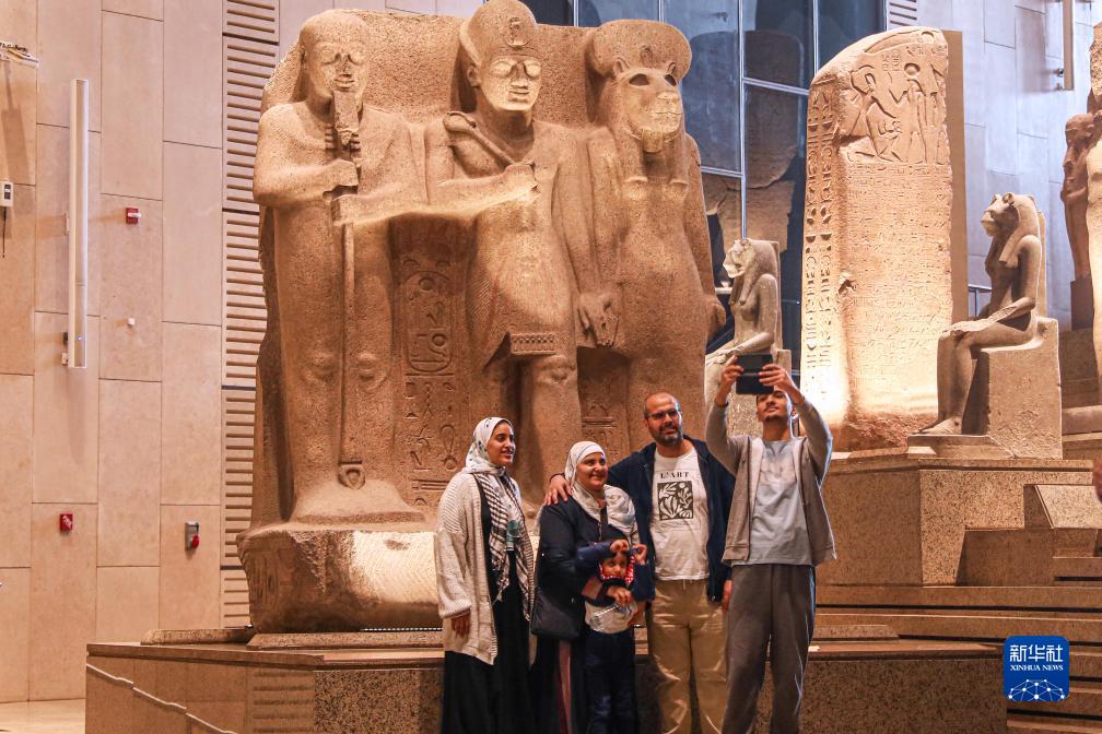 11月30日,人們在埃及吉薩的大埃及博物館參觀“大樓梯”走廊時與雕像合影。