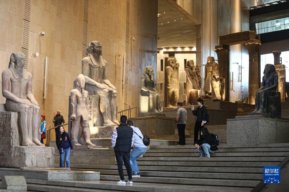 11月30日,人們在埃及吉薩的大埃及博物館參觀“大樓梯”走廊上的雕像。