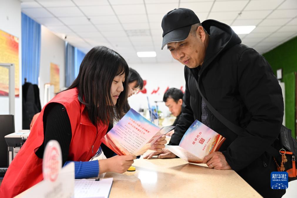 11月30日,在內蒙古呼和浩特市新城區蘇雅拉社區,信訪代辦員、社區工作人員(左)向群眾介紹信訪代辦政策。